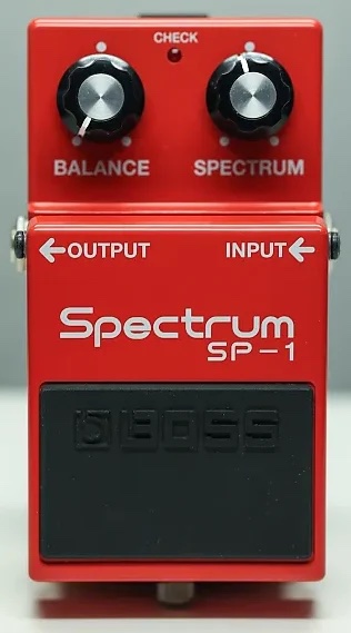 The SP-1 is a single-band parametric equalizer. The “Spectrum” knob sets the center frequency in a range from 500Hz to 5kHz. The “Balance” knob sets the amount to boost that frequency. The SP-1 was less popular with guitar players than it was with keyboard players, who used it to accentuate particular harmonic elements of electric pianos like the Fender Rhodes.